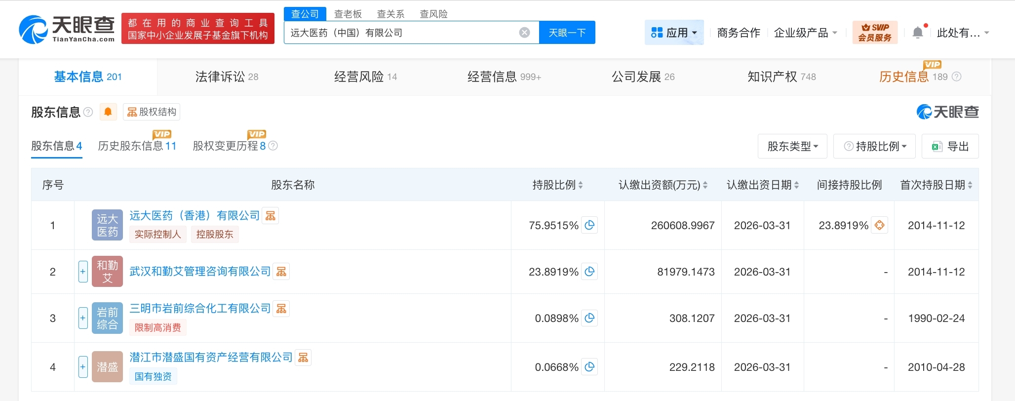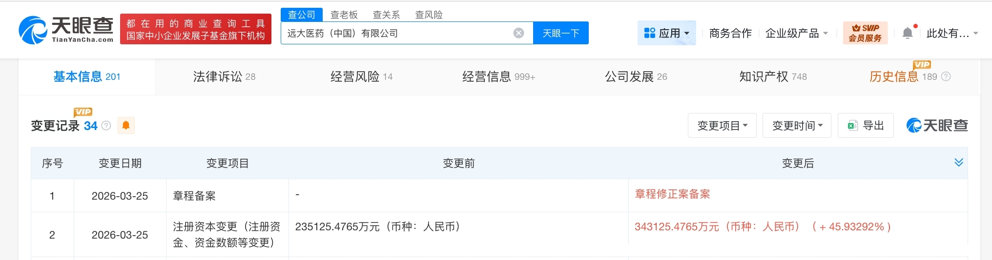每经AI快讯,天眼查工商信息显示,近日,远大医药(中国)有限公司发生工商变更,注册资本由约23.5亿元人民币增至约34.3亿元人民币,增幅约46%。该公司成立于1990年2月,法定代表人为唐纬坤,经营范围包括药品生产、药品批发、药品进出口等。股东信息显示,该公司由远大医药(香港)有限公司、武汉和勤艾管理咨询有限公司等共同持股。